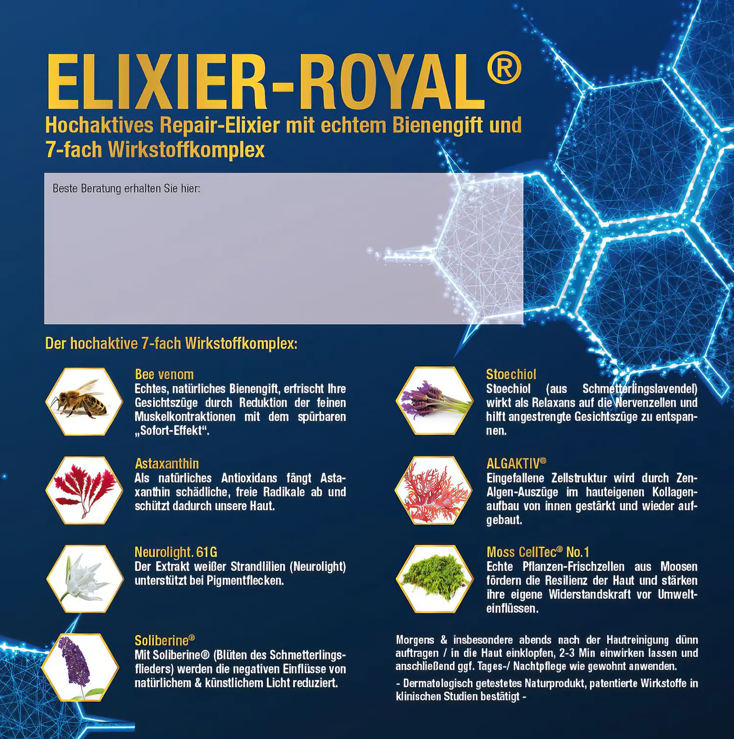 Elixier-Royal® ist ein hochaktives Repair-Elixier mit echtem, natürlich gewonnenem Bienengift und einem 7-fach Wirkstoffkomplex aus dem Hause Schloßwald-Bienengut®. Die Formulierung ist darauf ausgelegt, müde oder angespannte Gesichtszüge sichtbar zu erfrischen und der Haut neue Energie für die nächtliche Regeneration zu geben. Das Bienengift kann feine Muskelkontraktionen reduzieren und so für einen spürbaren Sofort-Effekt sorgen, während die Haut insgesamt glatter und entspannter wirkt.