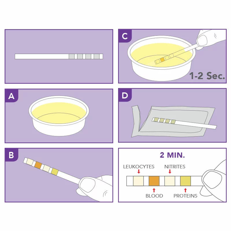 Der Test sollte verwendet werden, wenn Sie eines oder mehrere der folgenden Symptome haben: ständiger Harndrang, Brennen beim Wasserlassen, trüber und/oder übelriechender Urin. Es wird empfohlen, den allerersten Morgenurin zu verwenden.