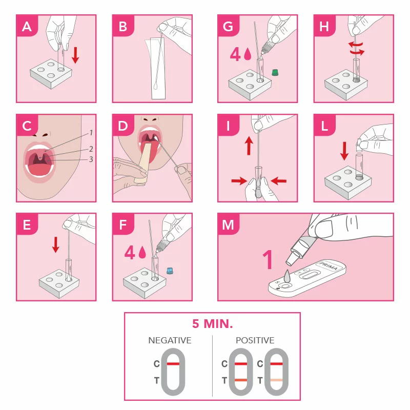 - Entnehmen Sie die Rachenprobe mit dem bereitgestellten Material;